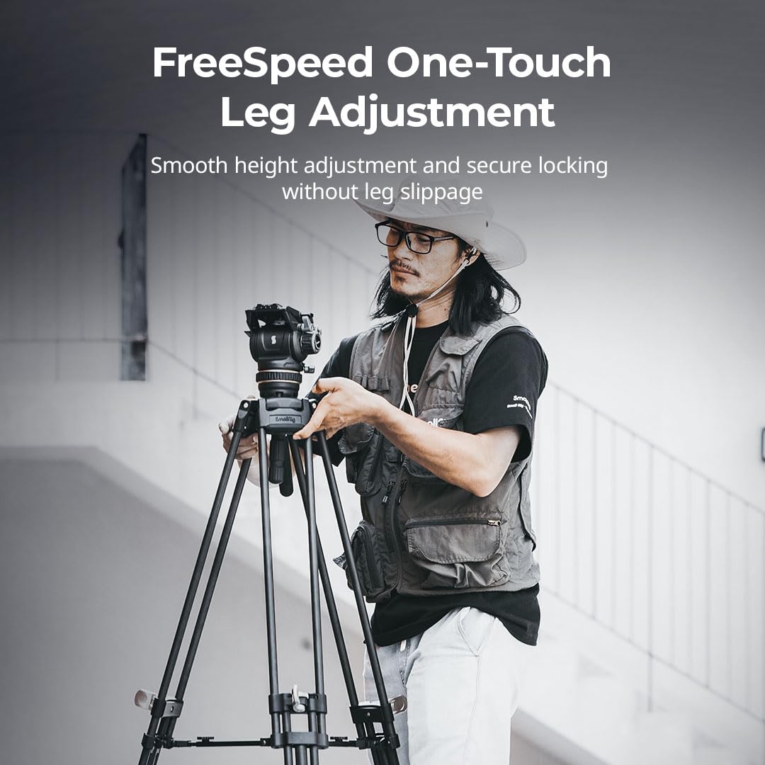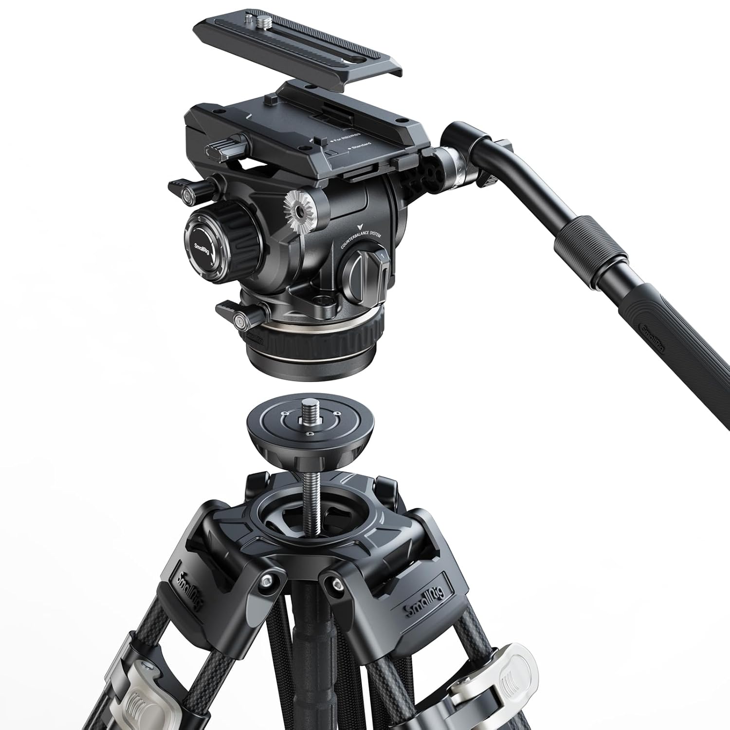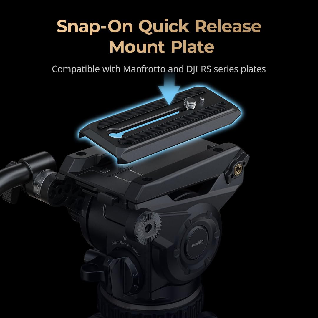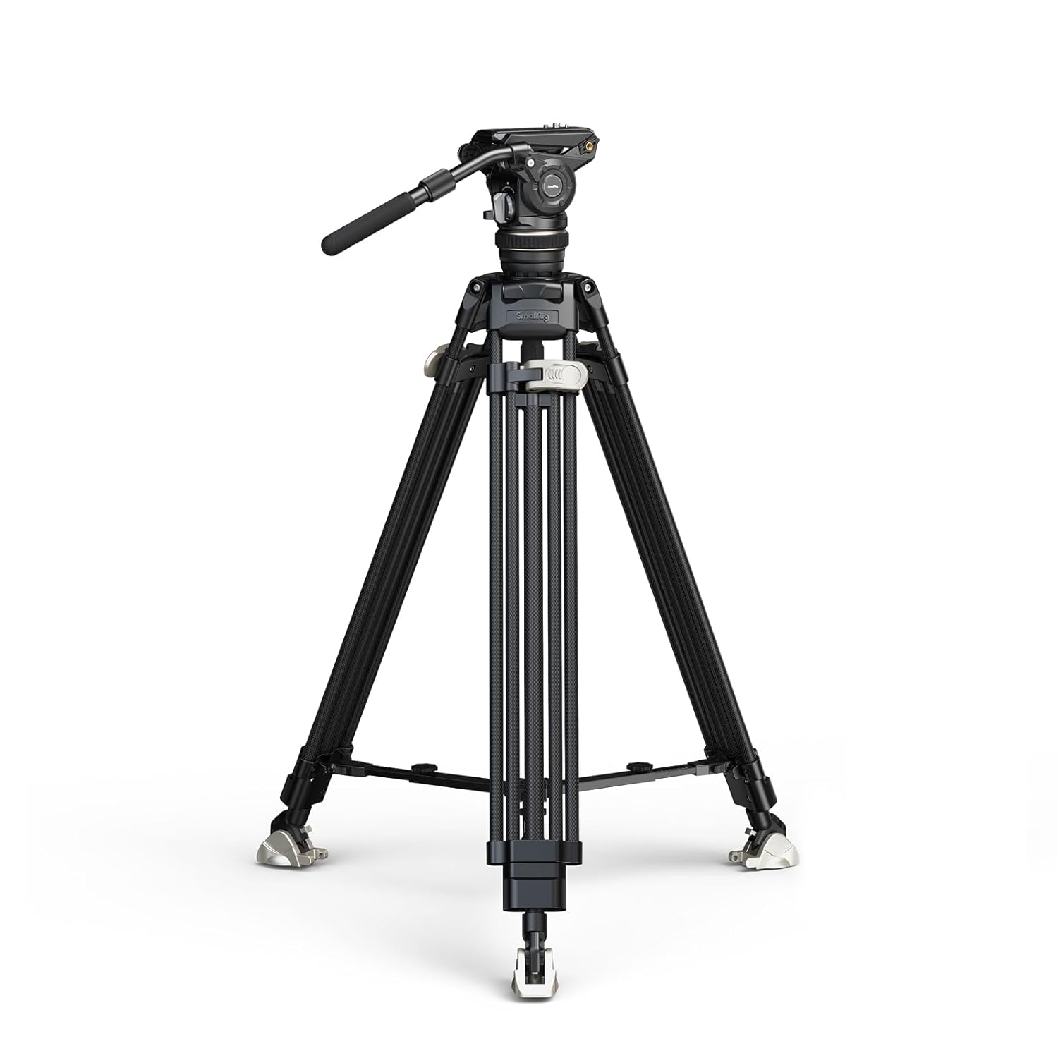 SmallRig Heavy-Duty Carbon Fiber Tripod Kit AD-120 4463 SmallRig Heavy-Duty Carbon Fiber Tripod Kit AD-120 4463 is a professional video tripod kit to facilitate video shooting. The tripod has adjustable legs, which can be quickly retracted and extended via flip locks. Operating Altitude ranges from 58cm (22.9in) to 197cm (77.6in), and the folded length is 99cm(38.9in). The fluid head features an adjustable 6-step counterbalance system. When the height of the gravitational center is 55mm / 2.2″, the 6-step counterbalance system balances the camera or other rigs (up to 8kg / 17.6lb) and accurately controls the camera tilt. The adjustable step-less damping system enables swivel and tilt adjustment and provides smooth pan and tilt camera movements. The fluid head 4464 adopts a new Touch-and-Go quick-release mount plate design which does not require alignment and is more efficient than traditional slide-in plates. It is DJI RS Series quick release plate and Manfrotto quick release plate compatible to realize a free switch between stabilizer shooting and tripod shooting. The user-friendly detachable telescopic handle allows rotation and attaching it to both left and right sides, making it suitable for any grip. Lightweight but sturdy carbon fiber tripod legs have interchangeable flat feet and spikes, ground and mid-level spreaders, and a bubble level. The package also includes a customized carrying bag for storage and protection of the product. Note: 1. Not sand dust resistant. 2. Max payload: 8kg / 17.6lb. 3. Please lock the mid-level spreader and ground spreader before using this tripod. Work With Manfrotto 501PL Quick Release Plate 75mm / 2.9in Bowl Adapter Packing List Tripod Kit x 1 Mid-level Spreader for Tripod x 1 Ground Spreader for Tripod x 1 Allen Wrench x 1 Carrying Bag x 1 Smartphone Holder x 1 User Manual x 1 Technical Data Product Dimensions: 990.0 x 165.0 x 165.0mm / 39.0 x 6.5 x 6.5in Package Dimensions: 1100.0 x 290.0 x 185.0 mm / 43.7 x 11.5 x 7.3in Product Weight: 5.9 ± 0.1kg / 13.0 ± 0.2lb Package Weight: 8.5 ± 0.1kg / 18.7 ± 0.2lb Operating Altitude: 58cm – 197cm / 22.8 – 77.6in Maximum Height: 197cm / 77.6in Minimum Height: 58cm / 22.8in Closed Length: 99cm / 38.9in Bowl Adatper Diameter: 75mm / 2.9in Tilt Range: +90°/-60° Counterbalance Payload: 1 – 8.0kg / 2.2 – 17.6lb Counterbalance: 6-Step Tilt Control: Continuously adjustable from 0 to max level Pan Control: Continuously adjustable from 0 to max level Load-Bearing Capacity: 8kg / 17.6lb Handle Length: 35.0- 53.0cm / 13.8 – 20.9in Material(s): Carbon Fiber, Aluminum Alloy, POM, Stainless Steel, Silicone